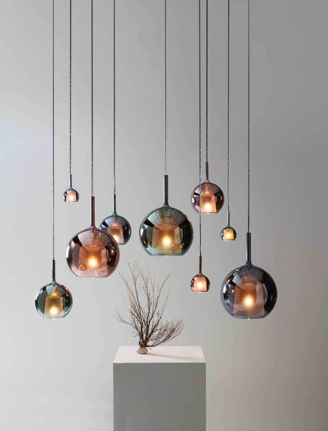 Diffusore esterno: trasparente, oro, argento, oro rosa, nero, 4ever, bronzo, verde, blu e viola. Diffusore interno sabbiato. Rosone a soffitto in titanio, bianco e nero.